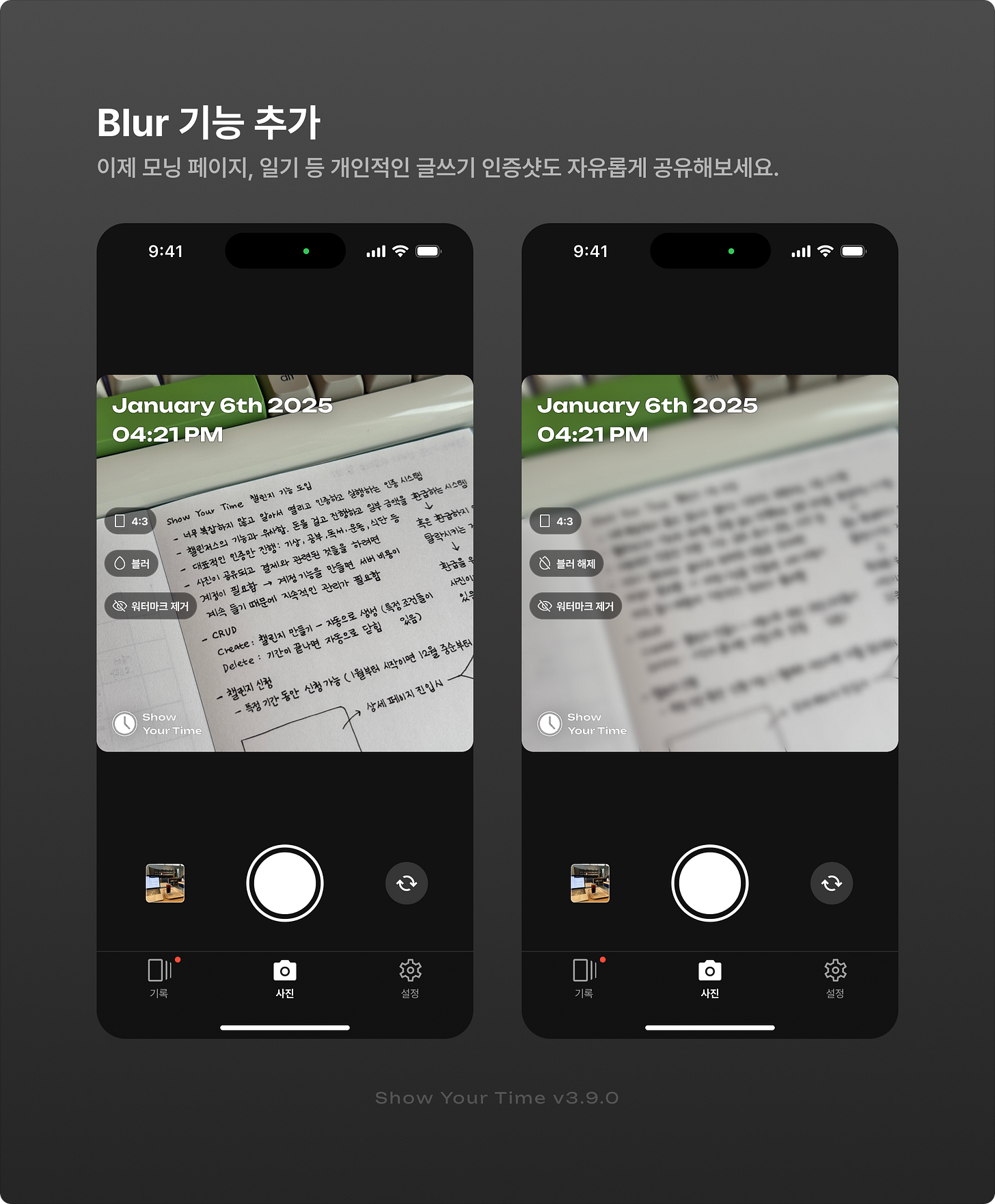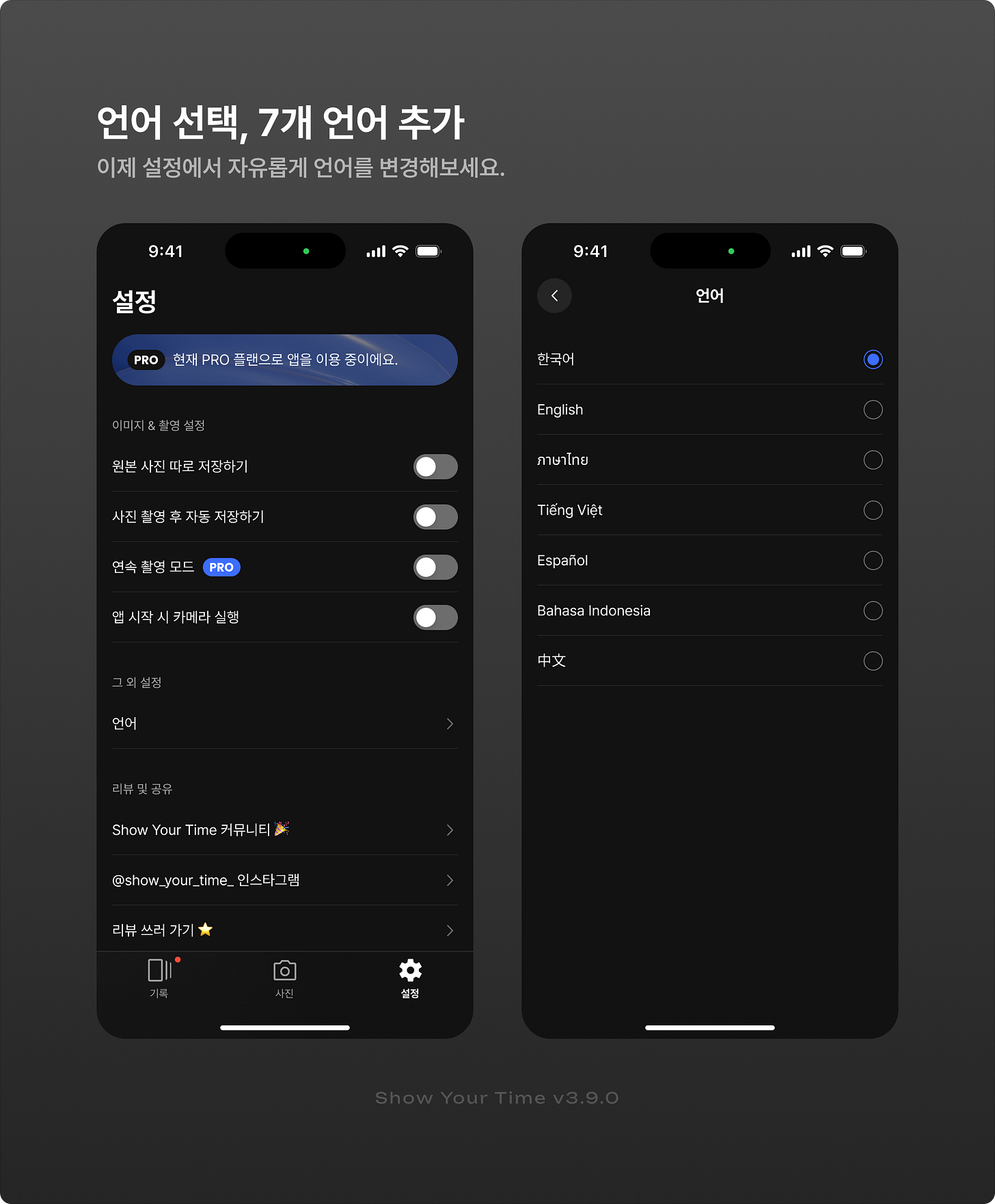 Show Your Time v3.9.0์ Blur์ ์ธ์ด ์ ํ ๊ธฐ๋ฅ์ ์ถ๊ฐํ๊ณ , ๊ธฐ์กด์ ์ง์ํ๋ ํ๊ตญ์ด์ ์์ด ์ธ์ ํ๊ตญ์ด, ๋ฒ ํธ๋จ์ด, ์คํ์ธ์ด, ํฌ๋ฅดํฌ๊ฐ์ด, ์ธ๋๋ค์์์ด, ํ๋์ค์ด, ์ผ๋ณธ์ด๋ฅผ ์ง์ํ๊ธฐ ์์ํ์ฌ ์ด 9๊ฐ์ ์ธ์ด๋ฅผ ์ง์ํฉ๋๋ค.