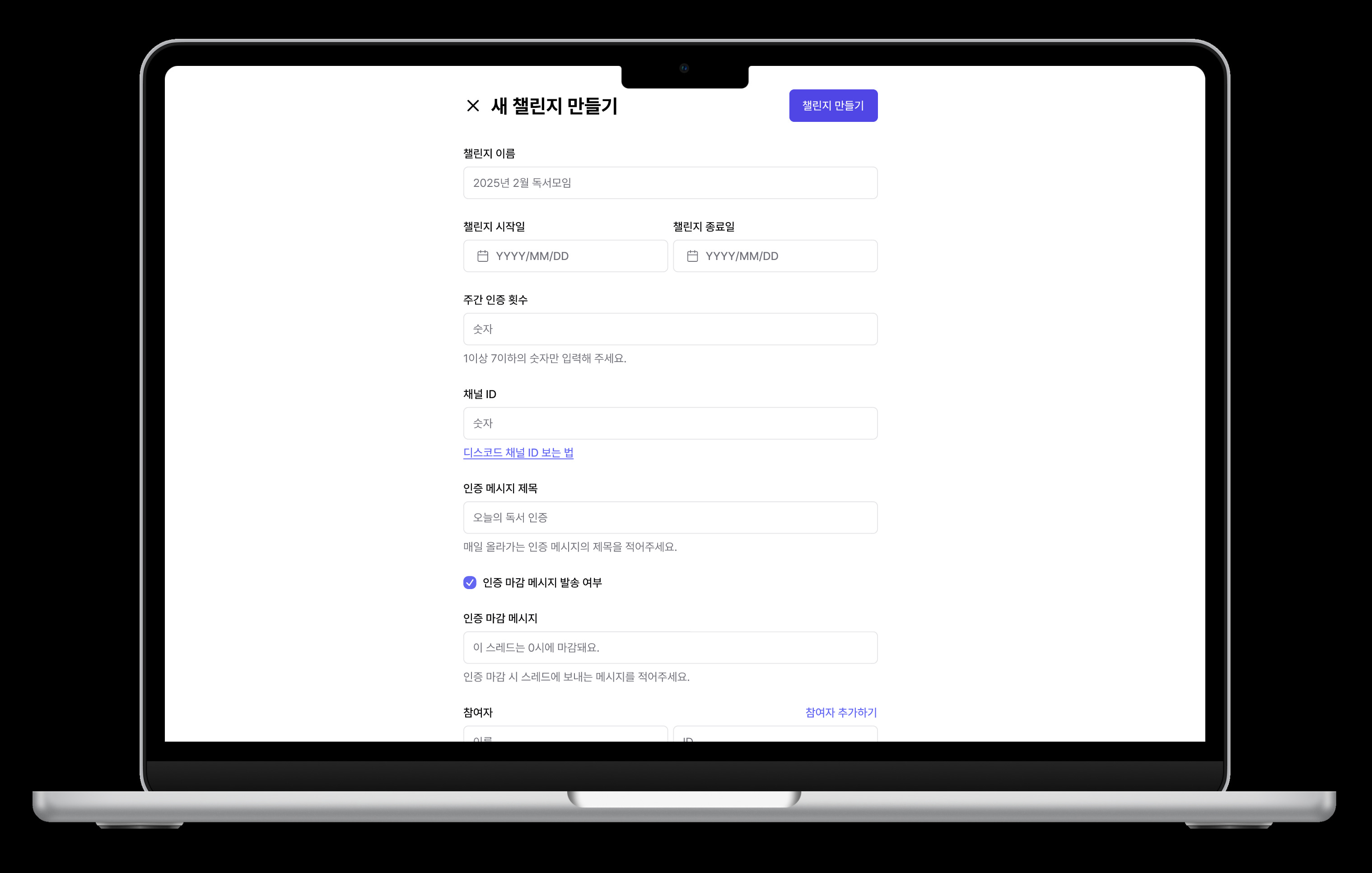 ๊ทธ๋์ ์ ํฌ๋ ์์ผ๋ก ๋ค์ํ ์ฑ๋ฆฐ์ง๋ฅผ ๋ ์ฝ๊ฒ ์ด์ํ ์ ์๋ ๊ฐ๋จํ ์ ํ์ ๋ง๋ค๊ธฐ๋ก ํ์ด์. ์ฑ๋ฆฐ์ง๋ฅผ ์ถ๊ฐํ๊ณ , ๋ฆฌ์คํธ๋ก ํ์ธํ๊ณ , ์ฐธ์ฌ์๋ค์ ํต๊ณ์ ํํฉ๋ ํ๋์ ๋ณผ ์ ์๋ ๊ธฐ๋ฅ์ ๋ด์ ์์ ์ ๋๋ค. ์ฒซ ๋ฒ์ ์ ๋์ค์ฝ๋์ ์ต์ ํํ์ฌ ์ถ์ํ๊ณ , ์ดํ์๋ ์นด์นด์คํก ์คํ ์ฑํ ๋ฐฉ์ ํ ์คํธ ์ถ์ถ ๊ธฐ๋ฅ์ ํ์ฉํด ์ธ์ฆ์ ๋ ์ฝ๊ฒ ์ถ์ ํ ์ ์๋๋ก ํ์ฅํด ๋๊ฐ ๊ณํ์ด์์. ์ด ์์ ๋๊ตฌ๊ฐ ์ ํฌ์ฒ๋ผ ์ฑ๋ฆฐ์ง๋ฅผ ์ด์ํ๋ ๋ถ๋ค์๊ฒ ์ค์ง์ ์ธ ๋์์ด ๋๊ธธ ๋ฐ๋ผ์.